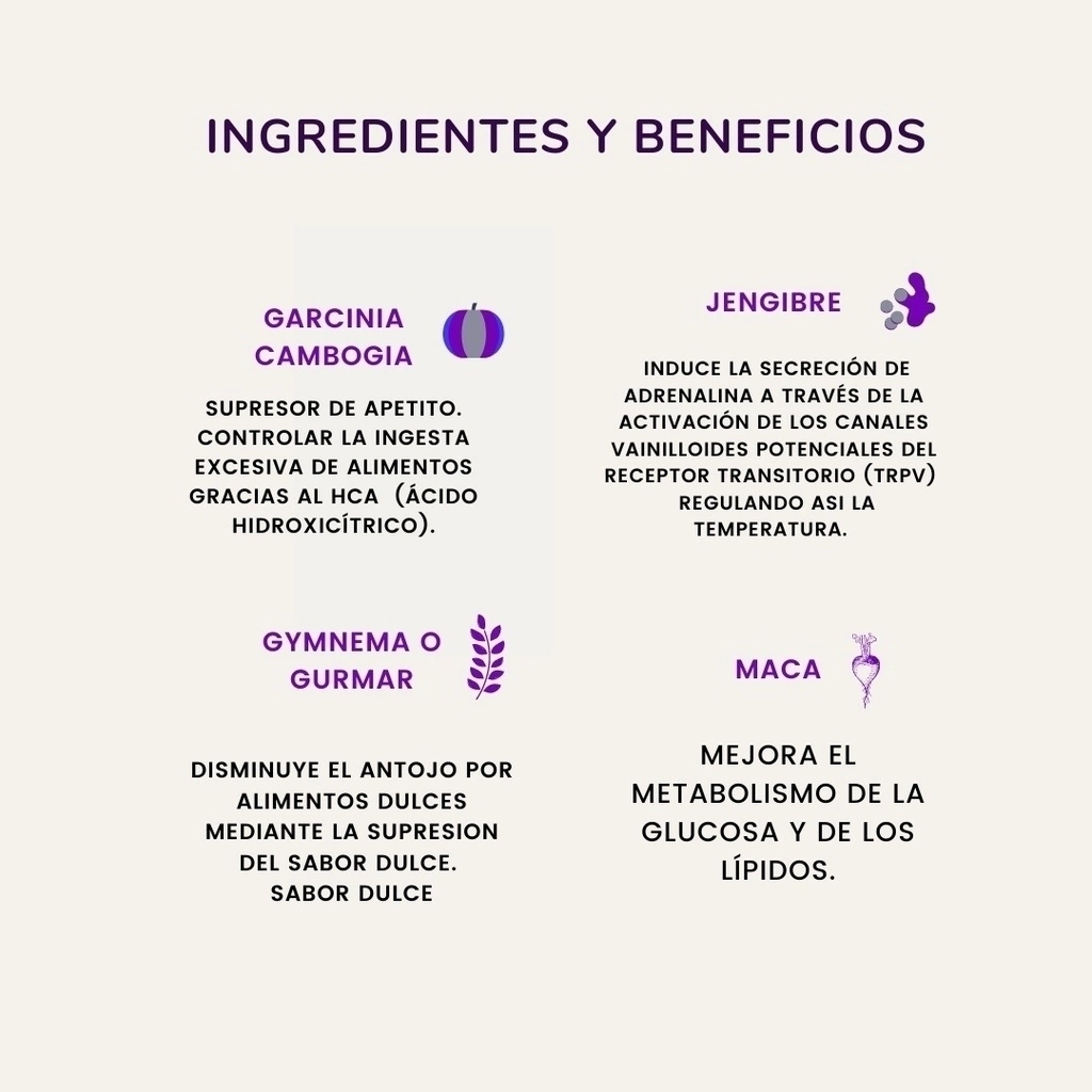 Ingredientes: Garcinia (Garcinia cambogia), Jengibre (Zingiber officinale), Gymnema (Gymnema sylvestre), Maca (Lepidium meyenii) y Mandarina (Citrus reticulata).